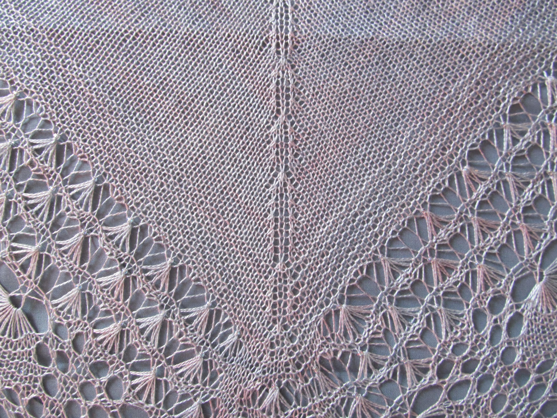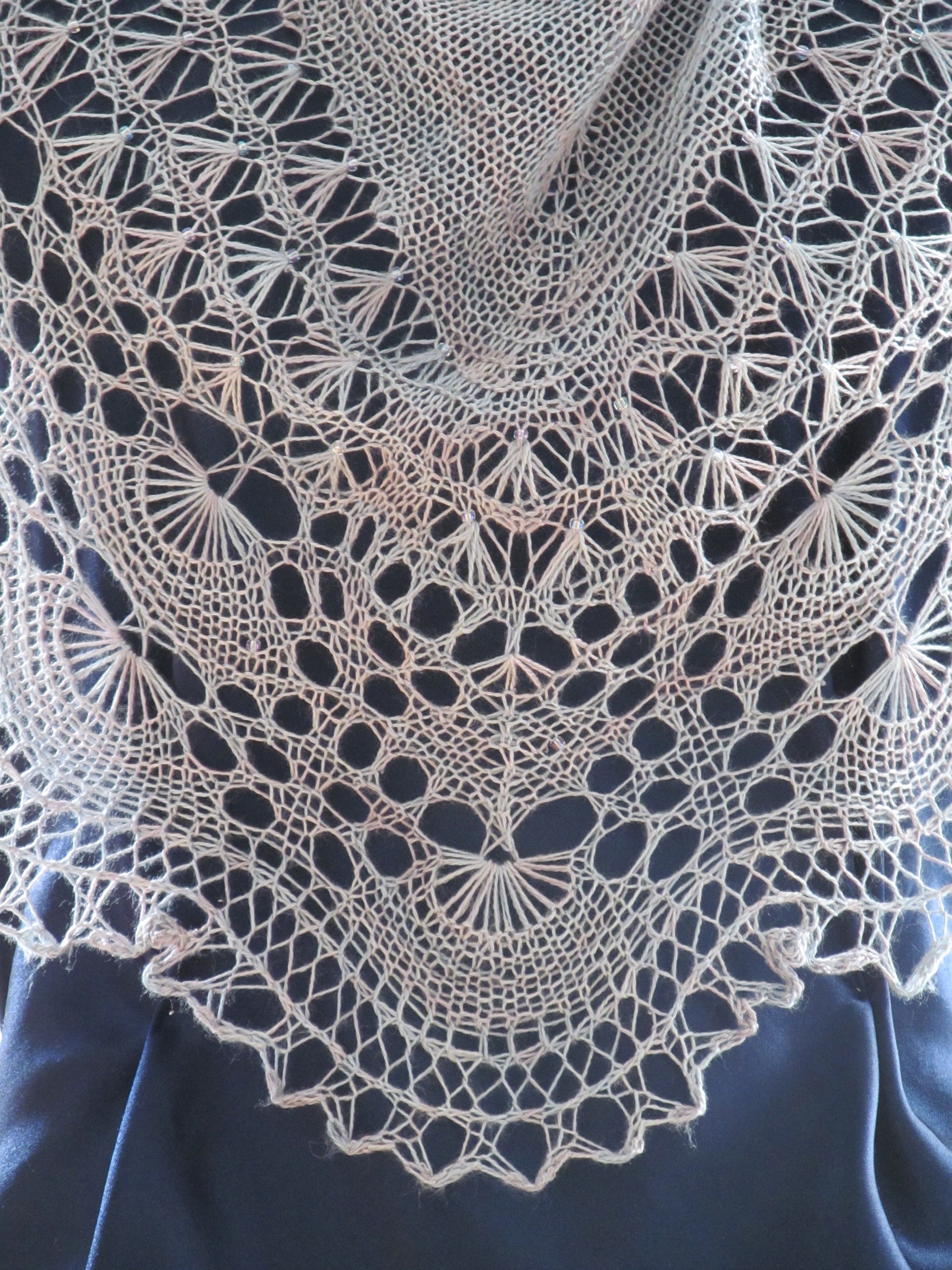 This amazing little shawl can be hand knit by you! The silk yarn I used was very suitable for these patterns of shells, sea and sand. Glass beads on the shells are mimicing water droplets.