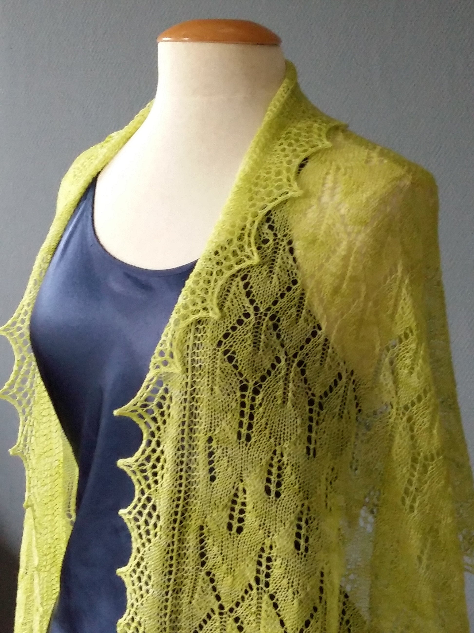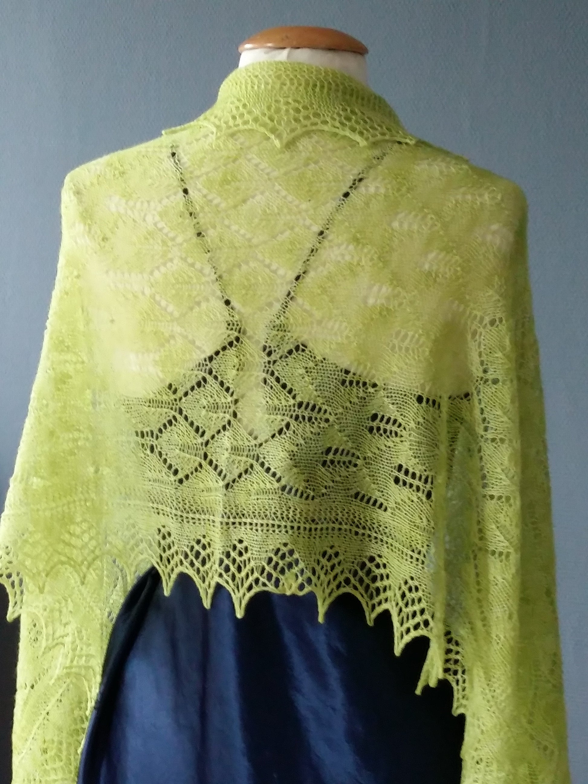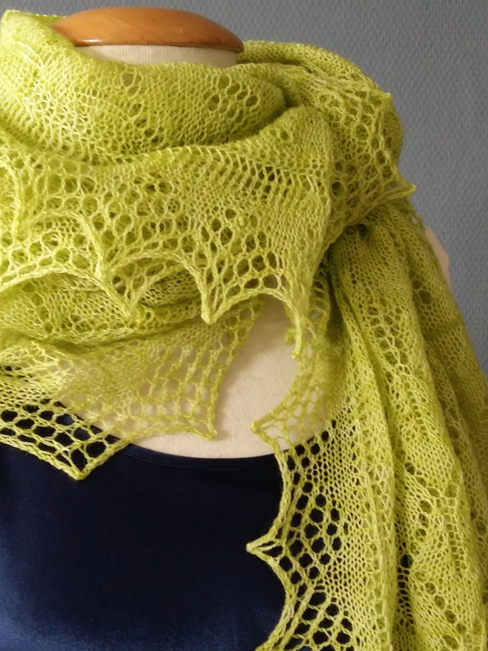 Een mooie shawl met eenvoudige patronen. Een prachtige kans om het kantbreien te oefenen.