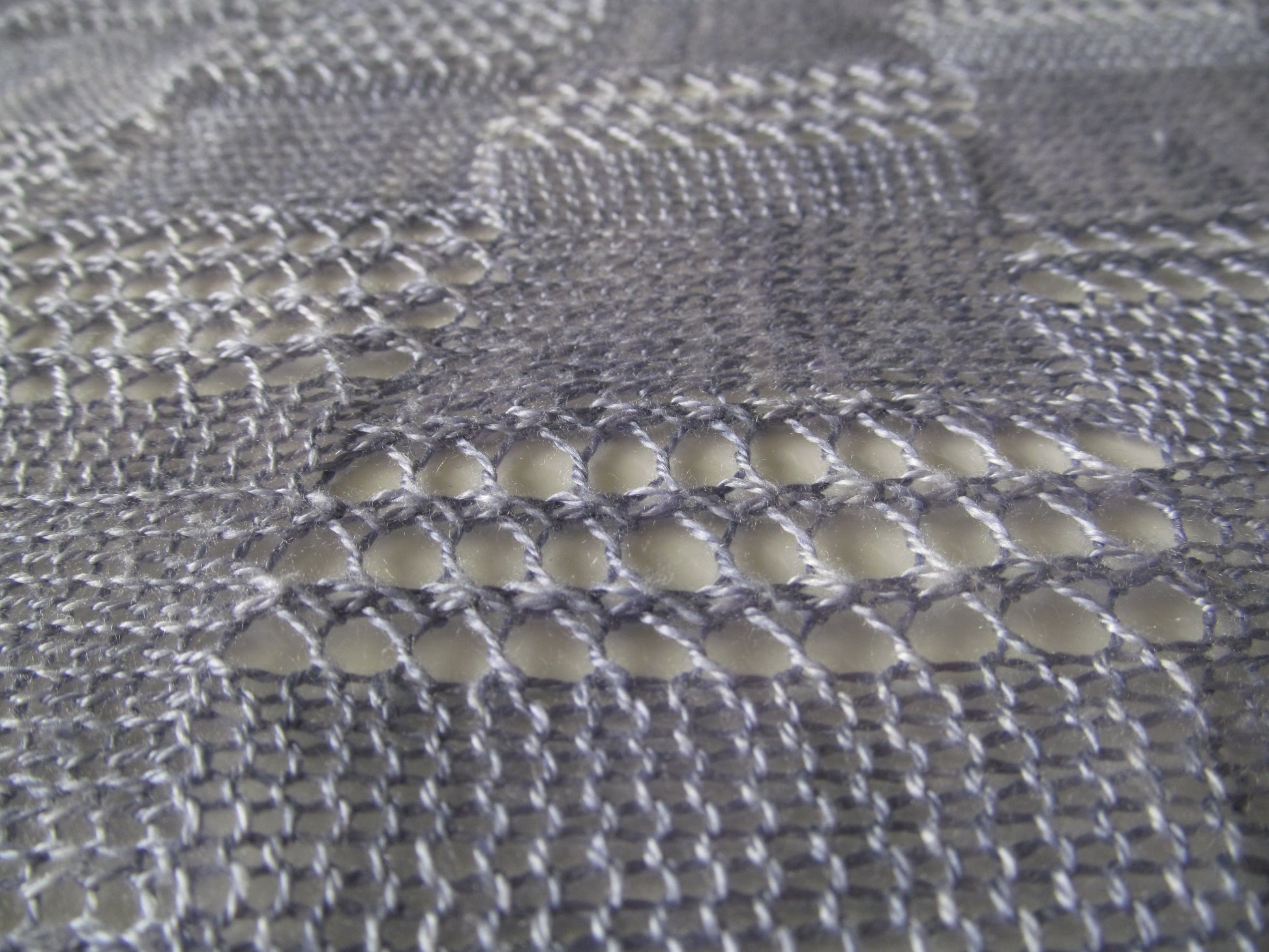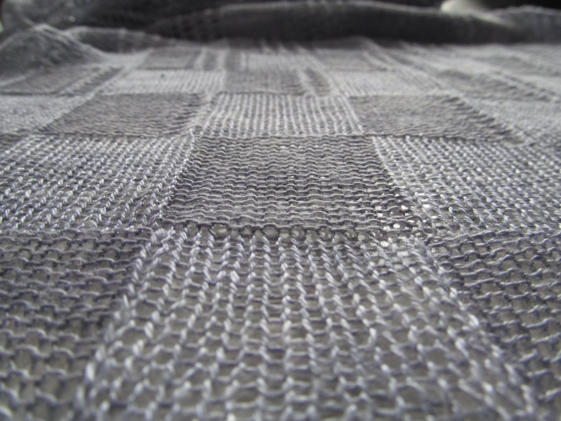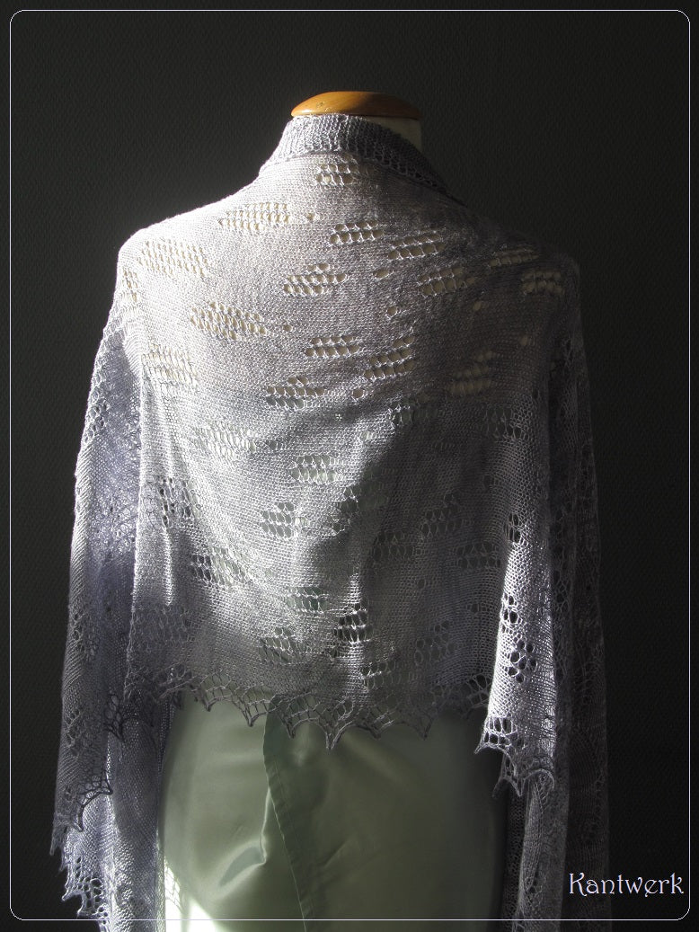 The shield of Zwartsluis is red and white blocked, which returns in this design. Near the village is a lot of water; Het Zwarte Water and Meppeler Diep. The blocks from the shield pattern merge to waves at the other end of the shawl. This rectangle shawl is worn so the open lace pointed edging at the bottom is fully visible. The shade of this lovely silk yarn, 100% Mulberry Silk, gives is a nice shine and makes it drape beautifully.