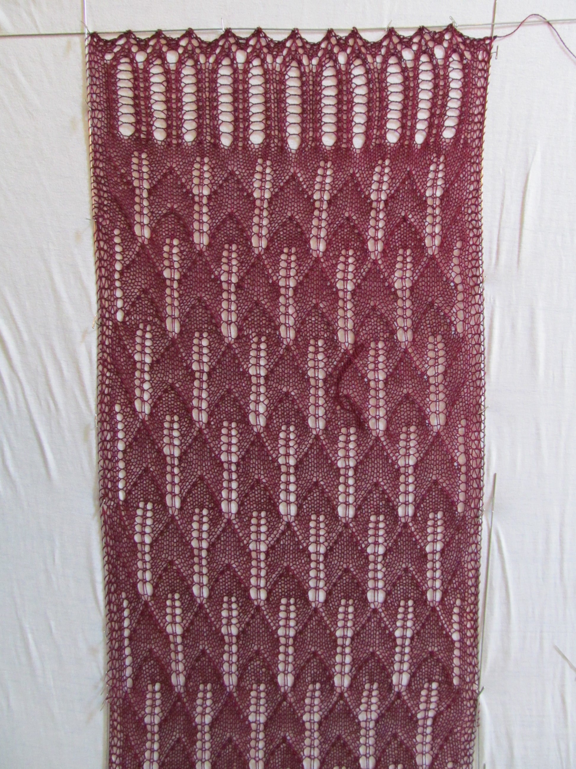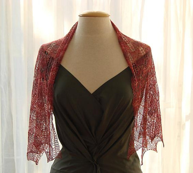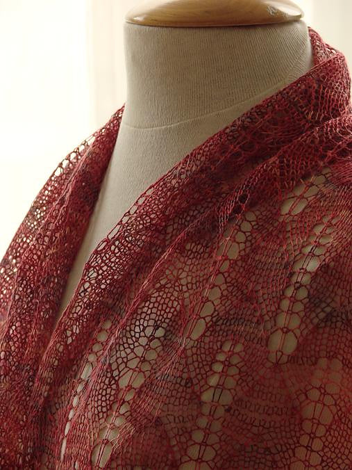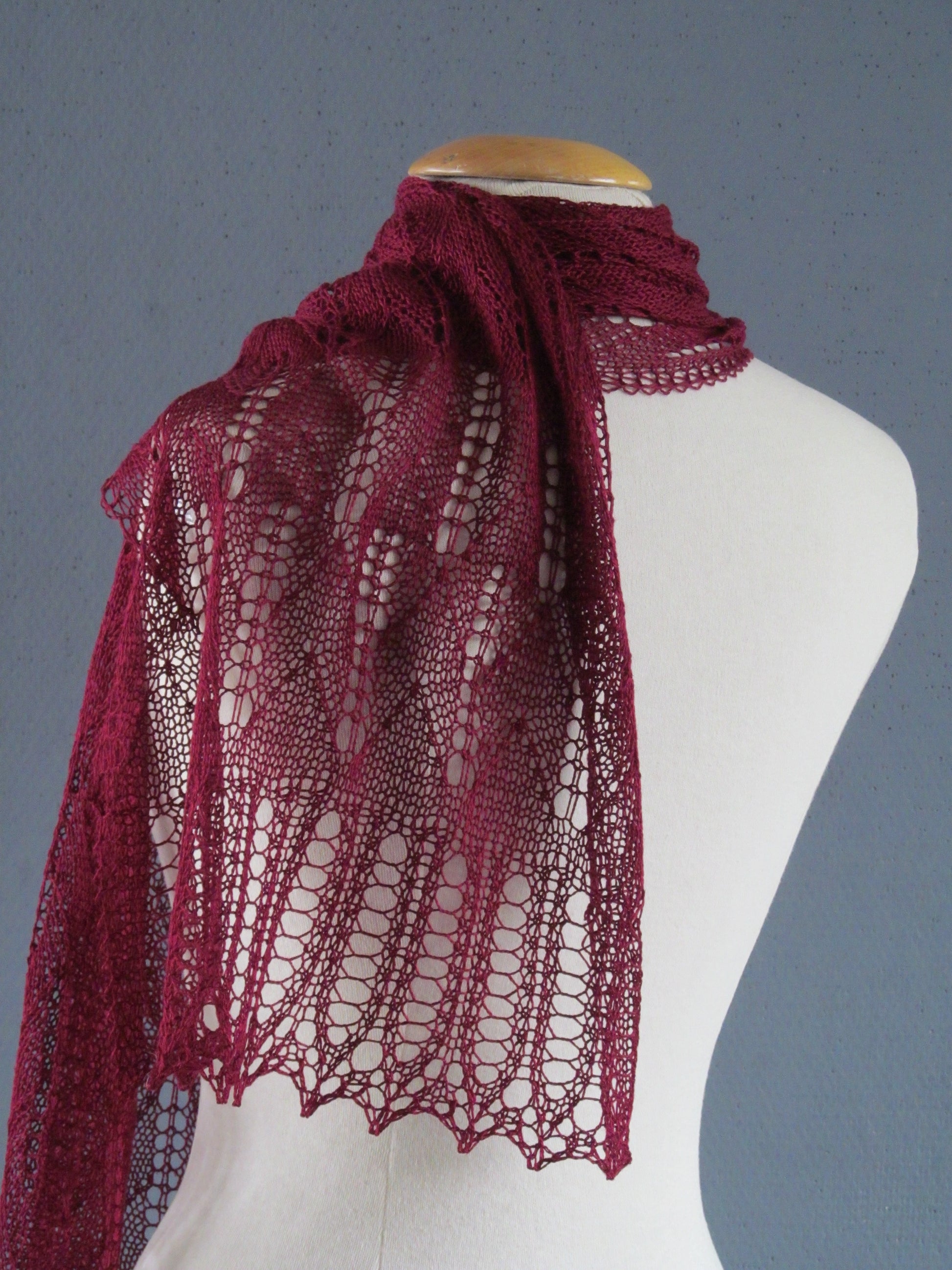 A very pretty little shawl in variegated red silk. The pattern can be repeated endlessly, but in this case a single skein was enough. It’s a delightful shawl to wear, the light variations in color add to the pattern.
