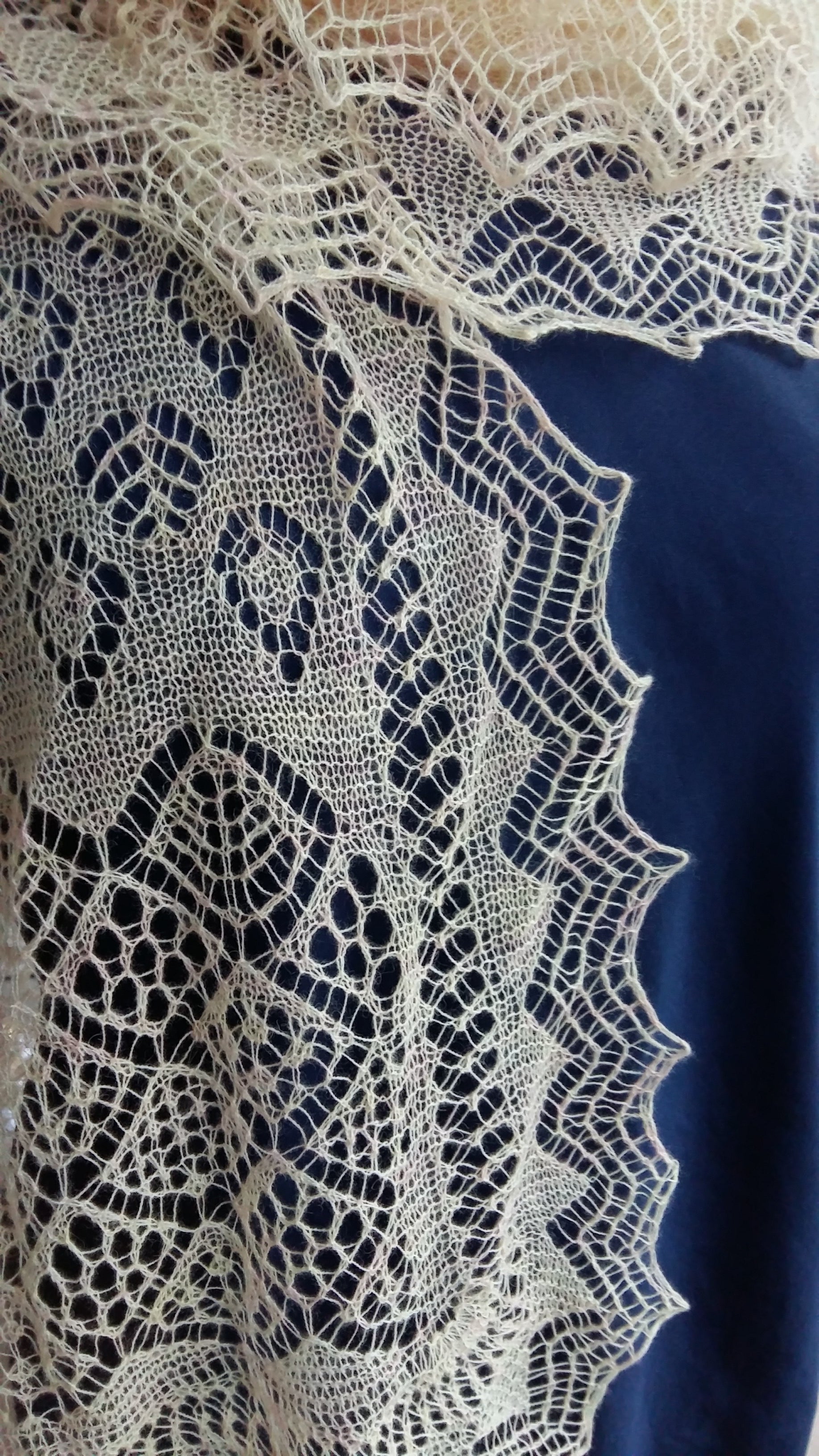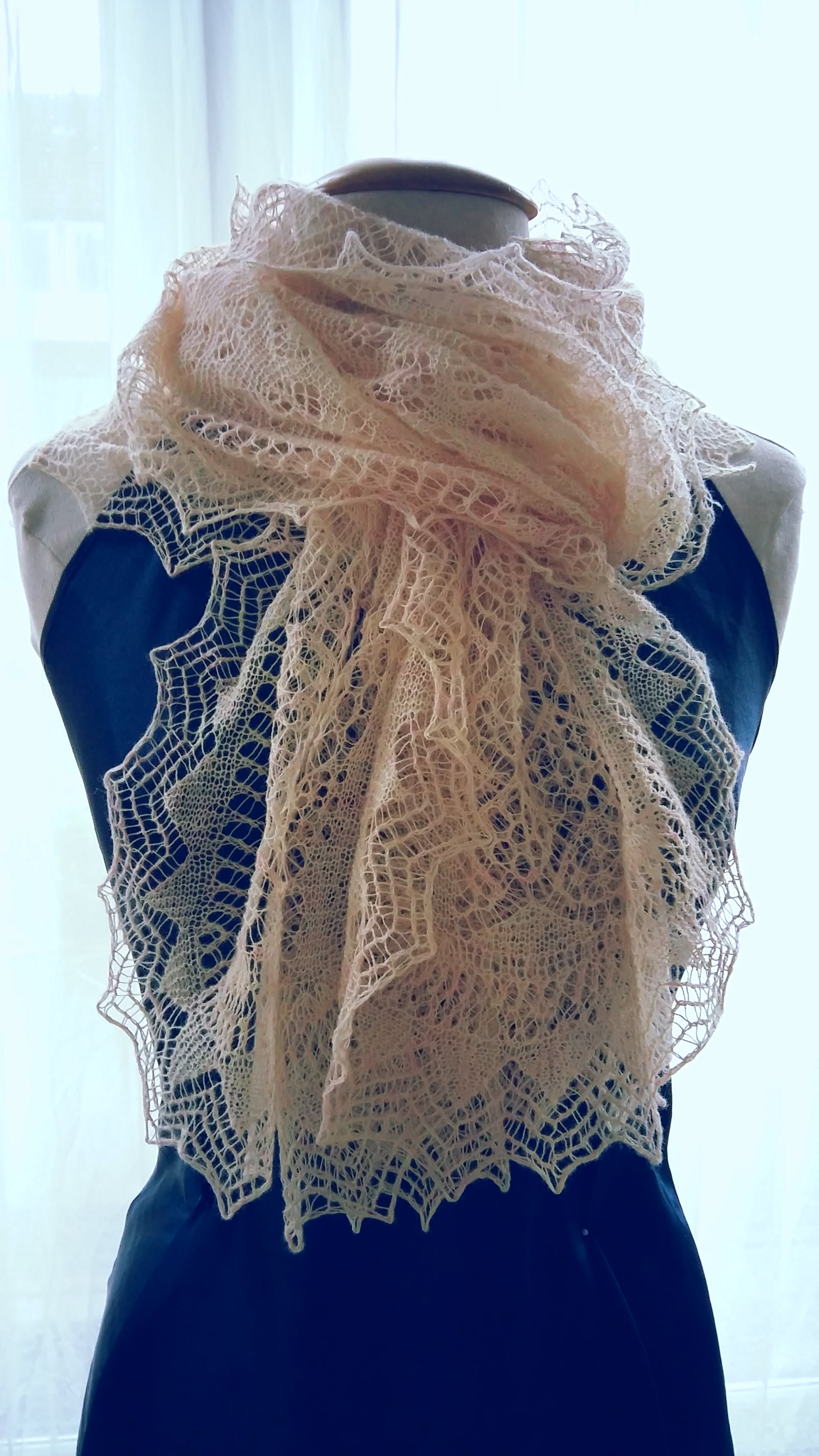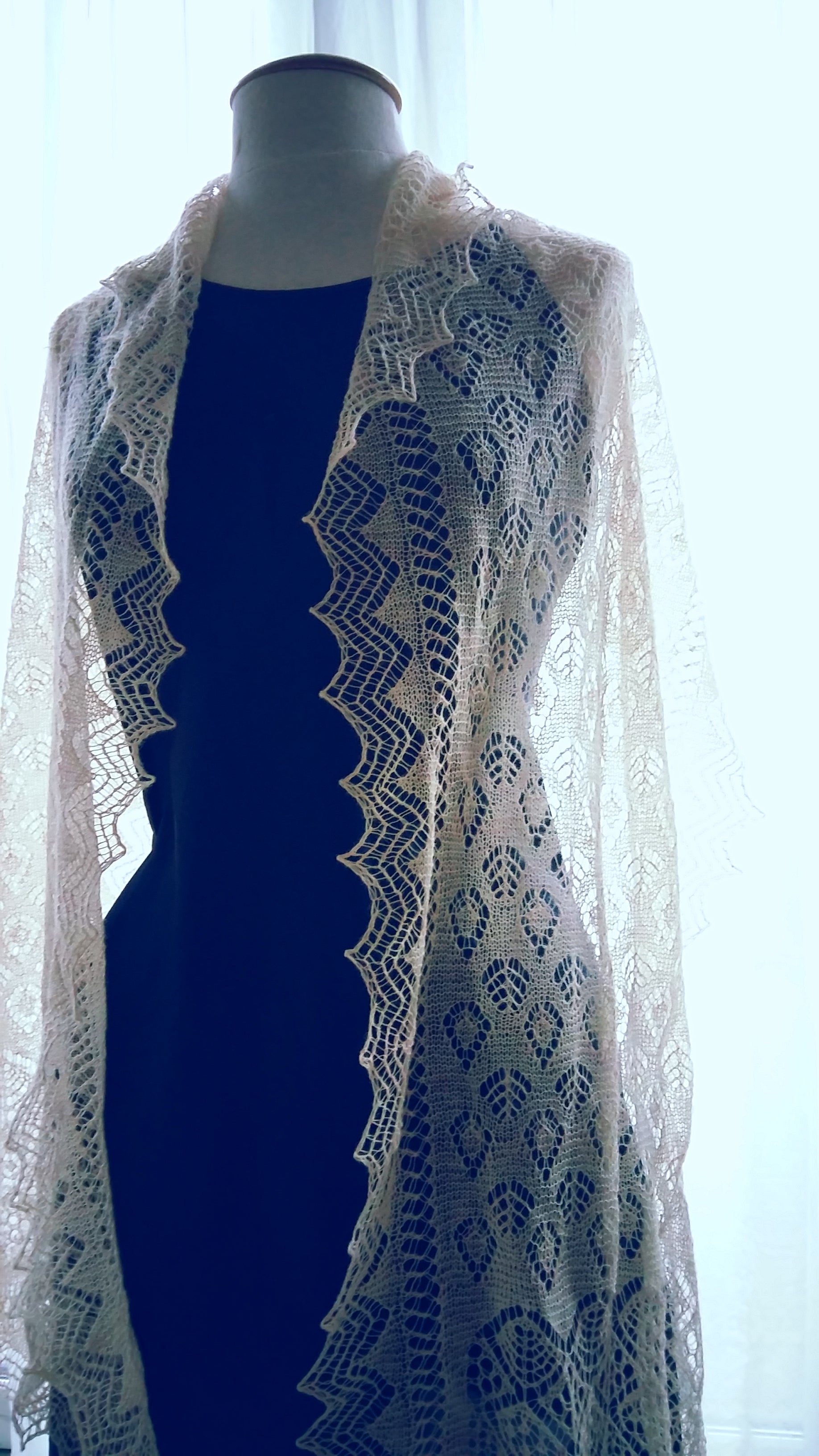 Because of the colour of this shawl, you will see the lace patterns, no matter how you wear it.