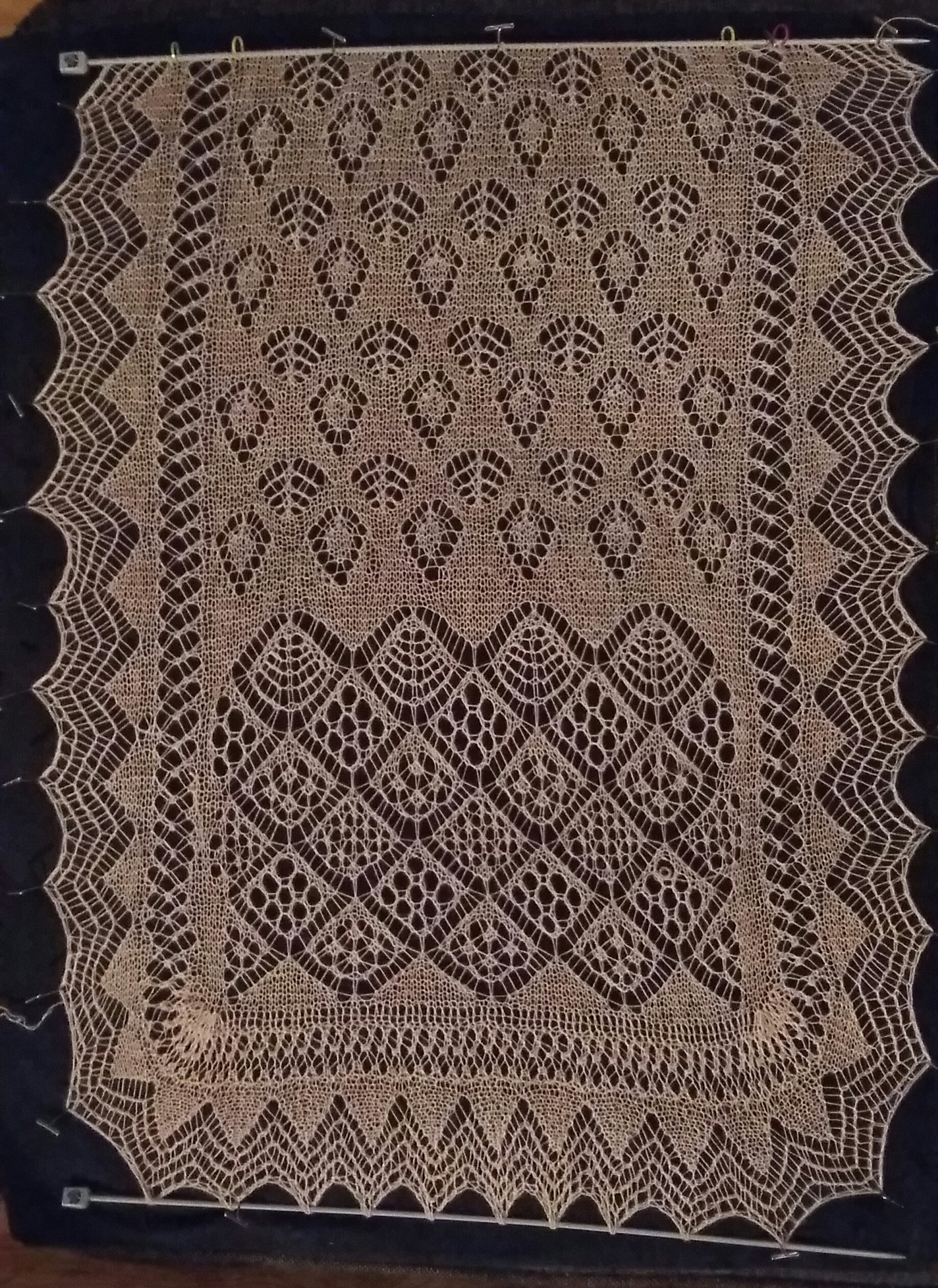 This design can be worked in several fine lace yarns. Be sure, when you use a thicker yarn than The Gossamer Web Sheherazade, you’ll need MORE yarn. The shawl will become wider and longer too.