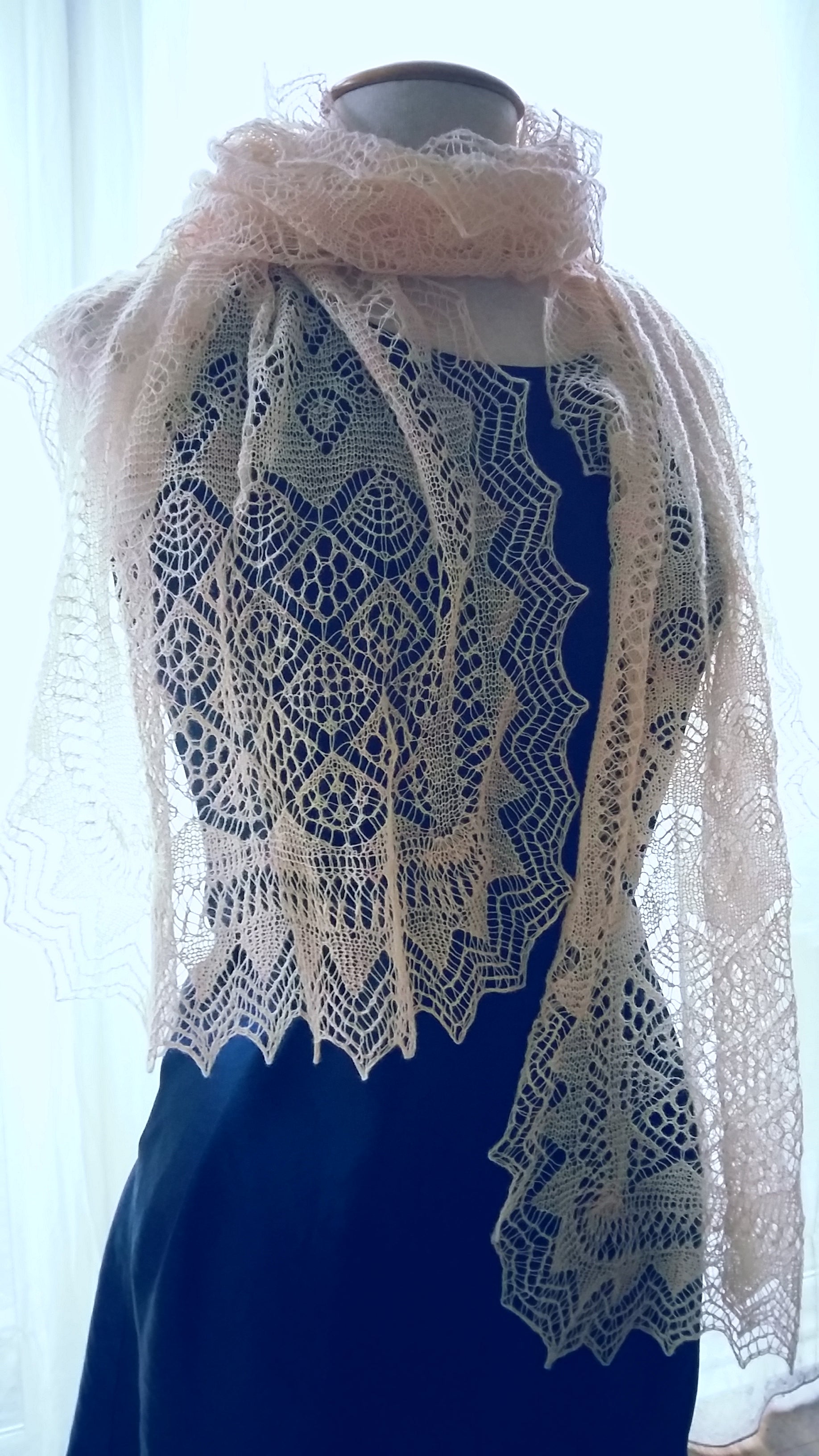 Een smalle shawl met prachtige patronen. Vooral het midden patroon valt mooi als je hem los draagt. Beide helften zien er gelijk uit.