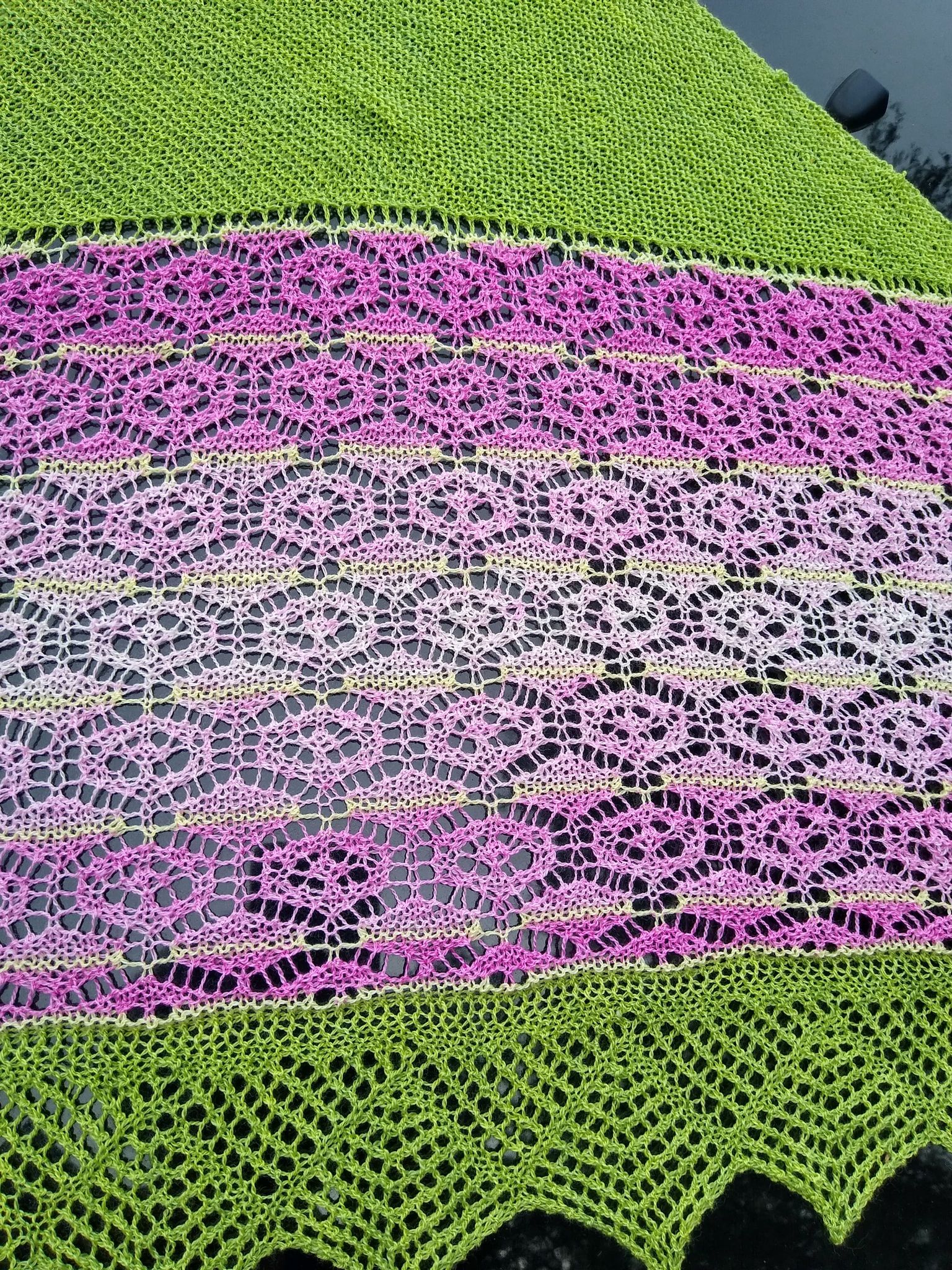 A shawl that comes in 2 shapes, a square and a triangle. It has a heartbeat accent row which stands out immediately.