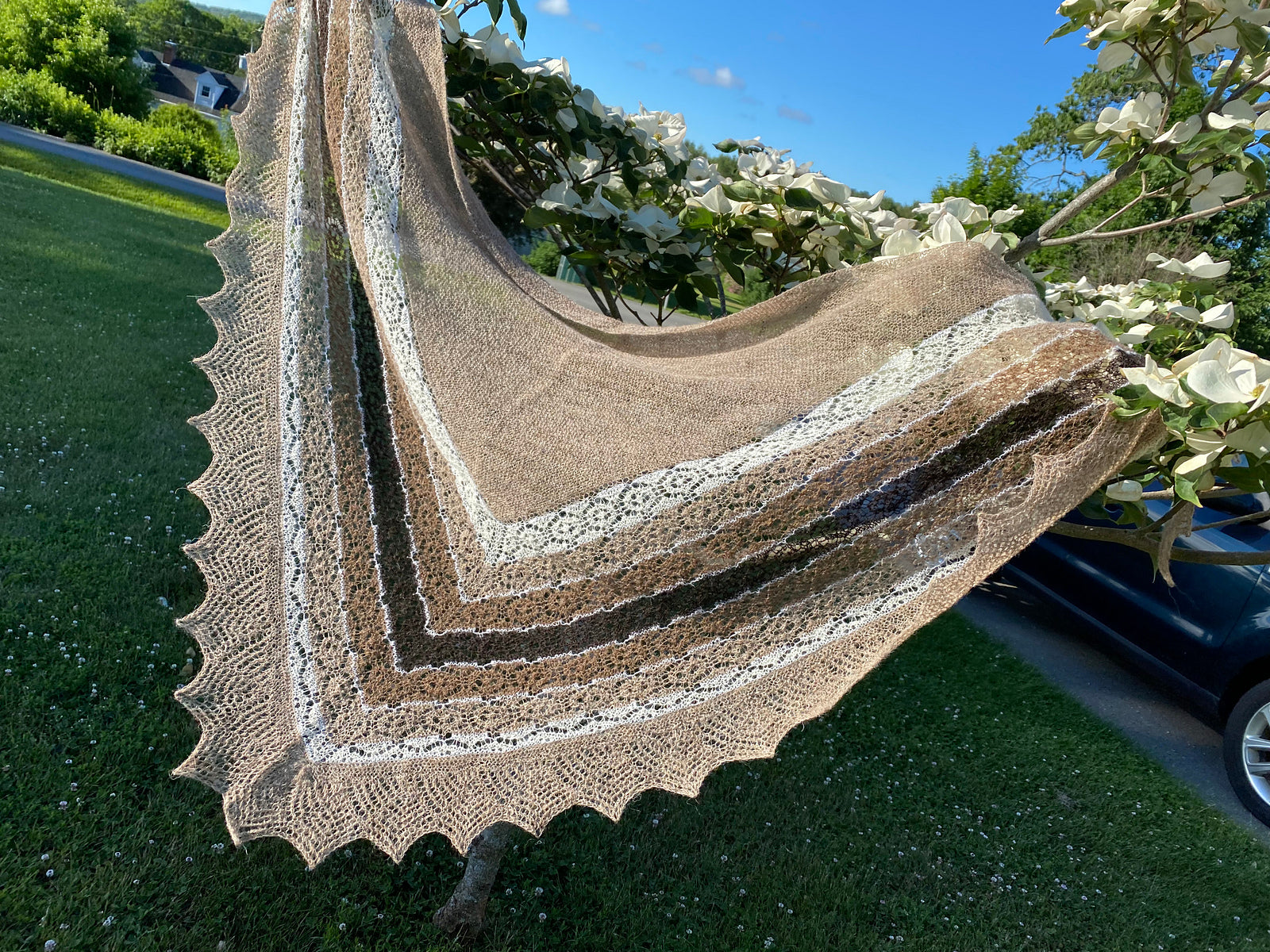 The colours for the Hap have been hand dyed by Debbie Chisholm (Canada) on the 1ply J&S Supreme.