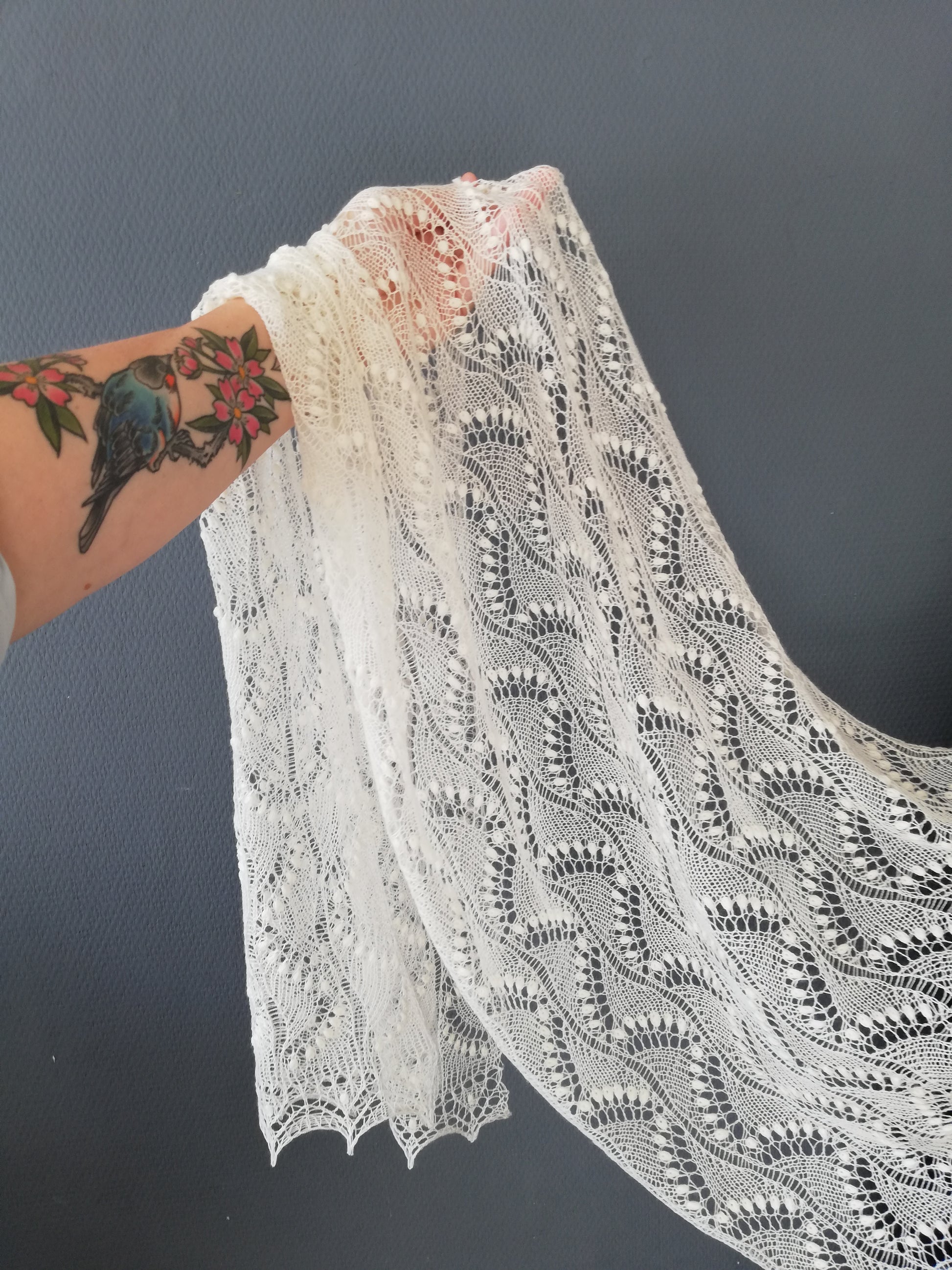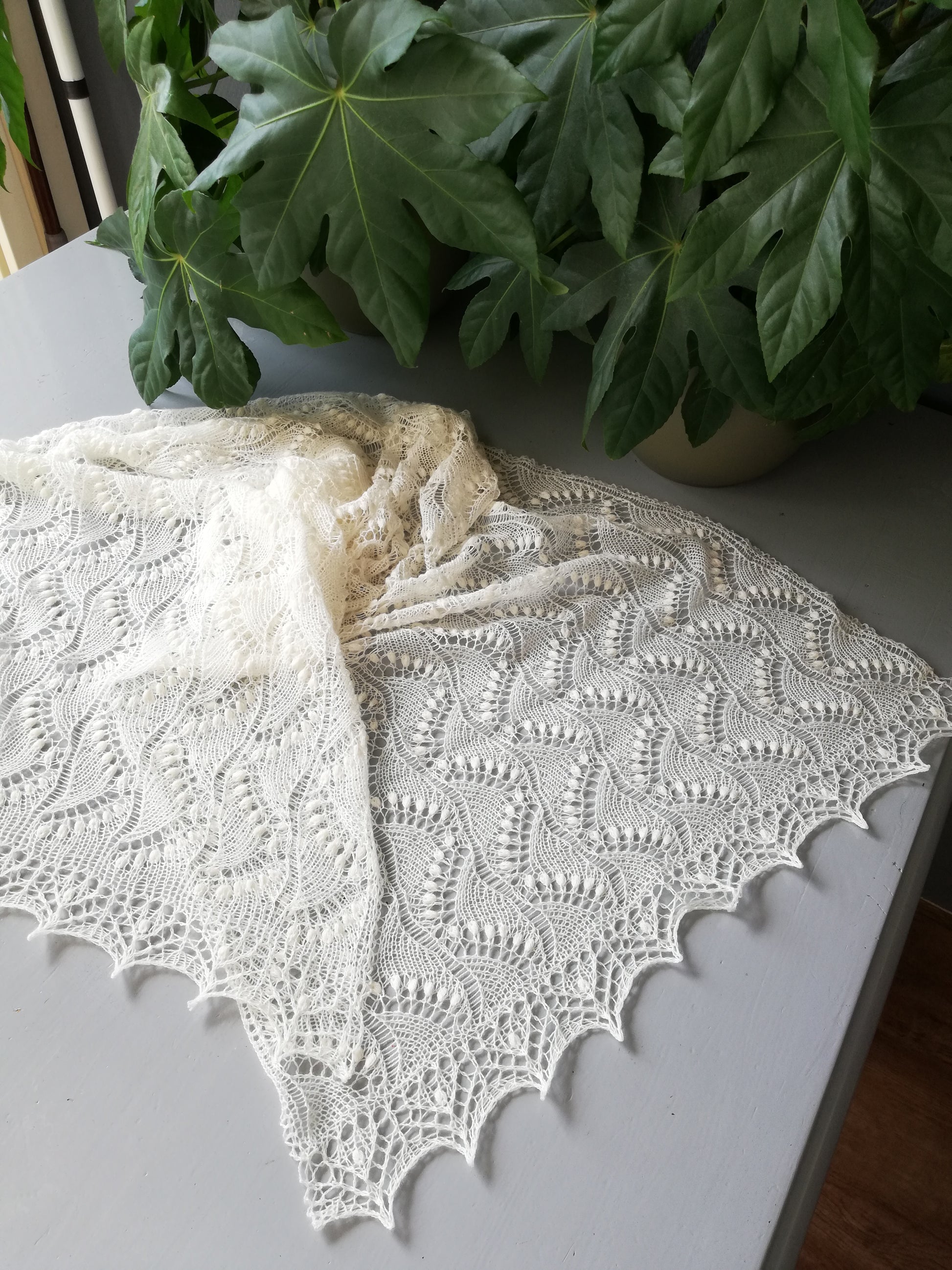 Merula is latijn voor Merel. Het patroon van deze shawl vind ik lijken op de bewegingen van vogel vleugels.