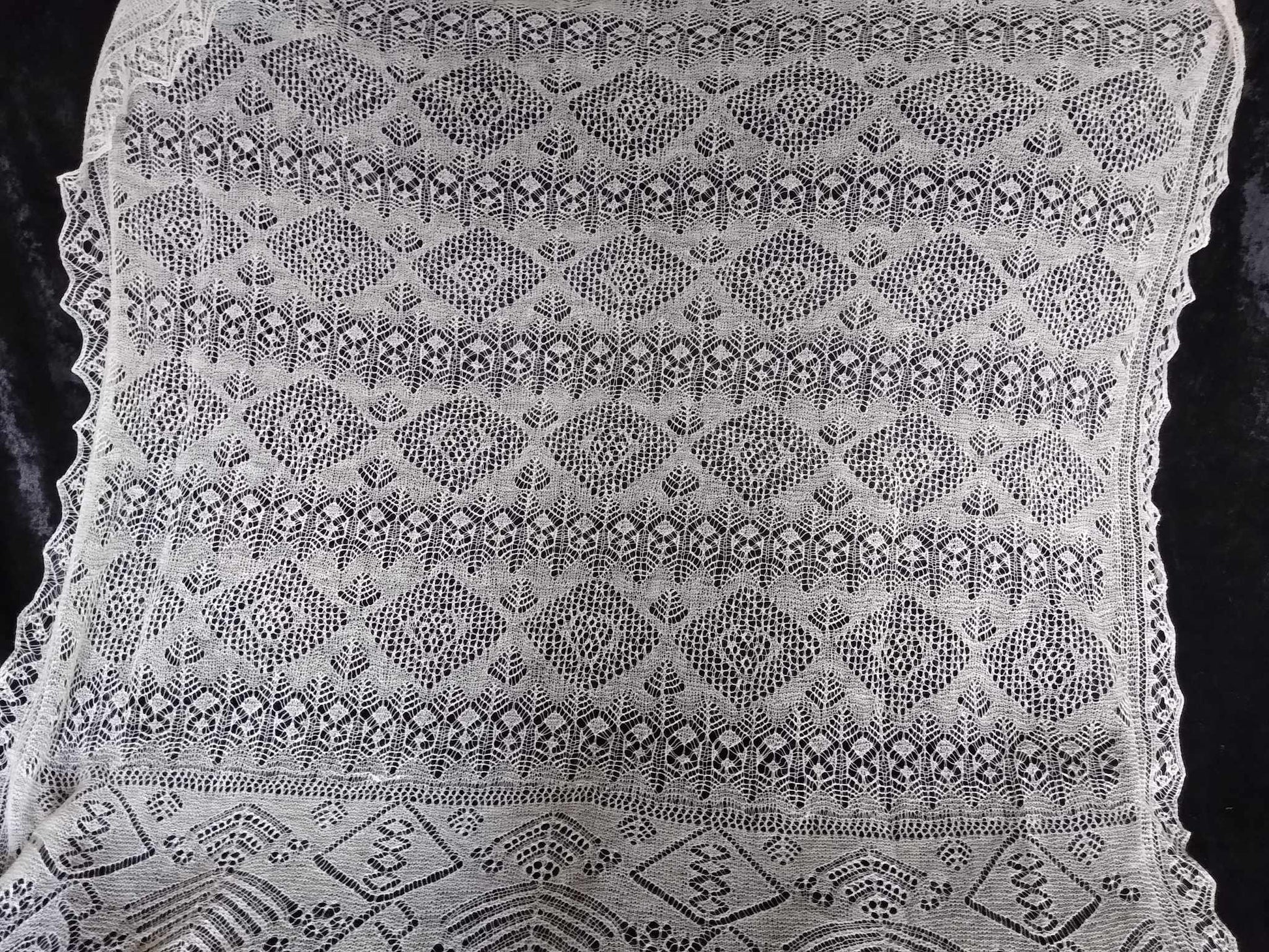 This shawl was in ownership by Mary Whitlock and presented by her to the Fine Shetland Lace group on Facebook.