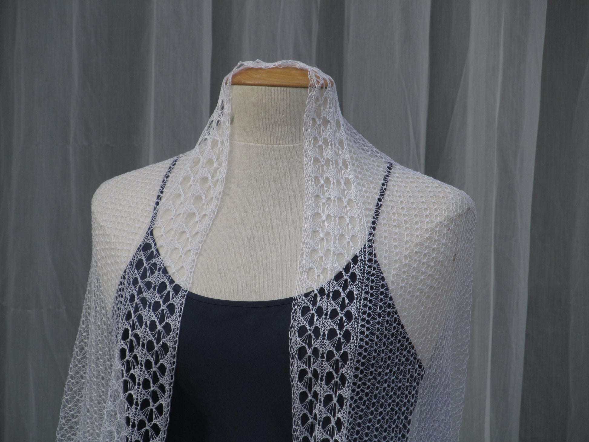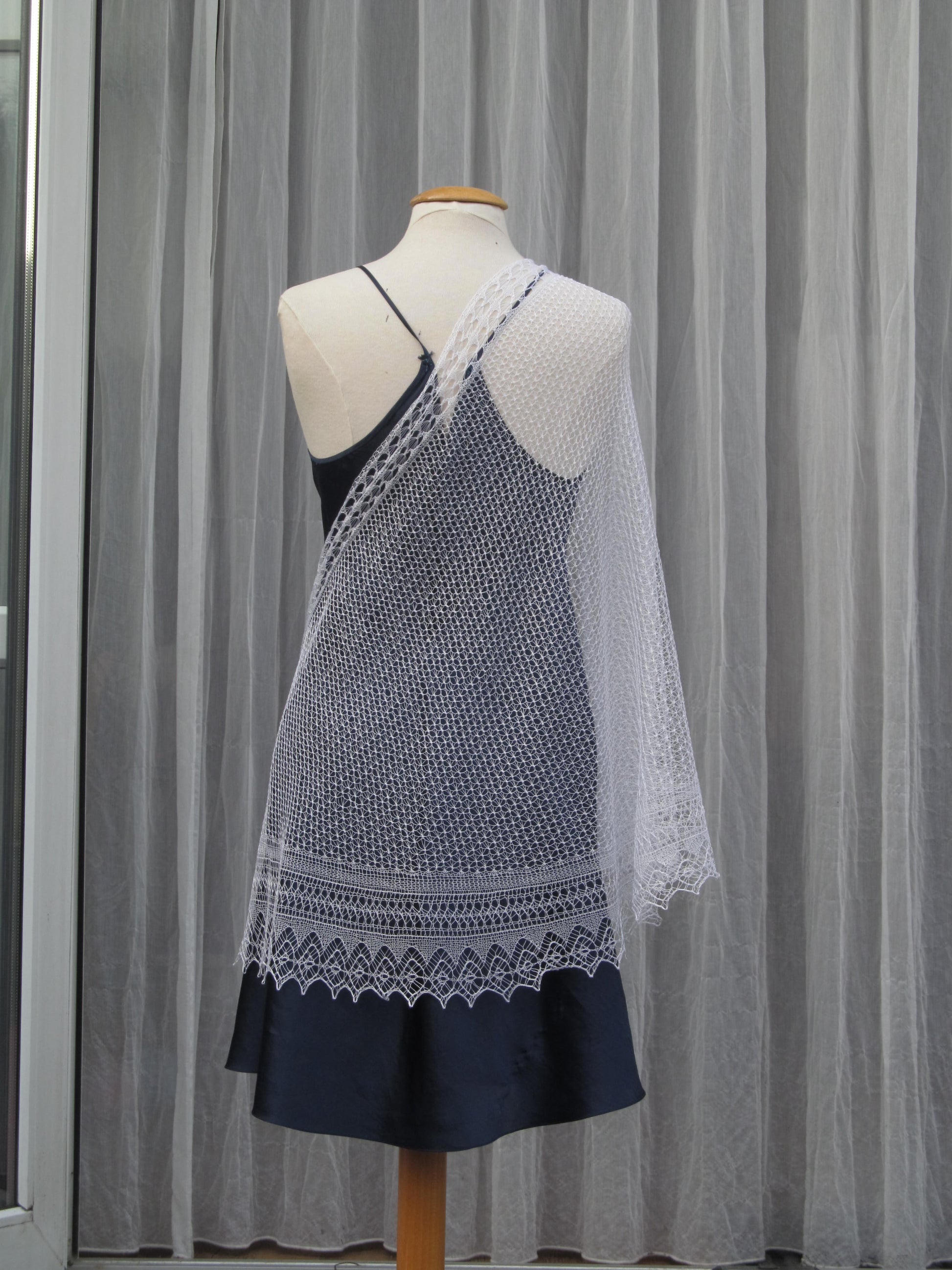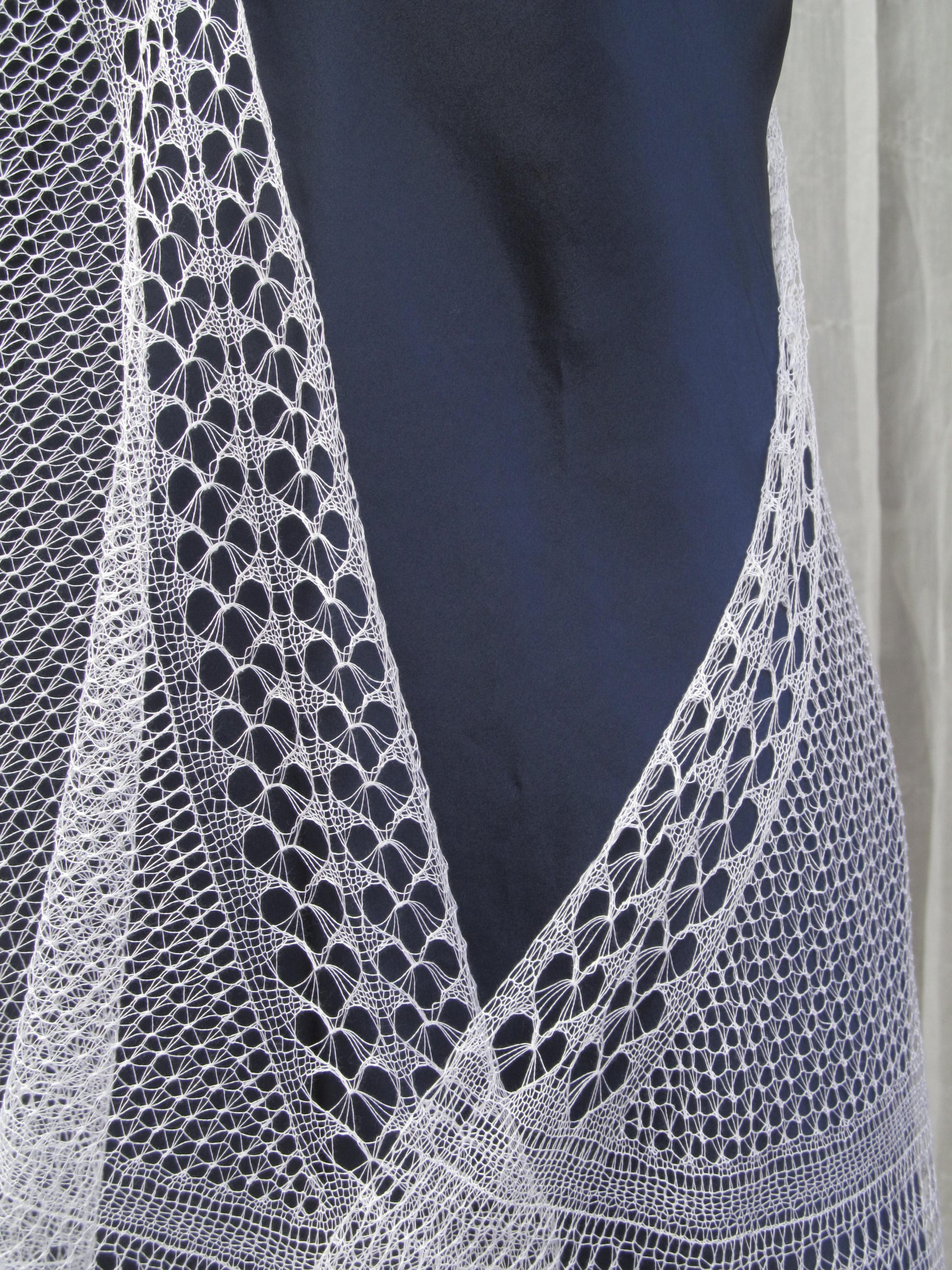 NEW: additional instructions for a new shape. As seen in the Fruity Knitting Podcast on YouTube. Wedding veil that can be attached to the head, draped around the back.