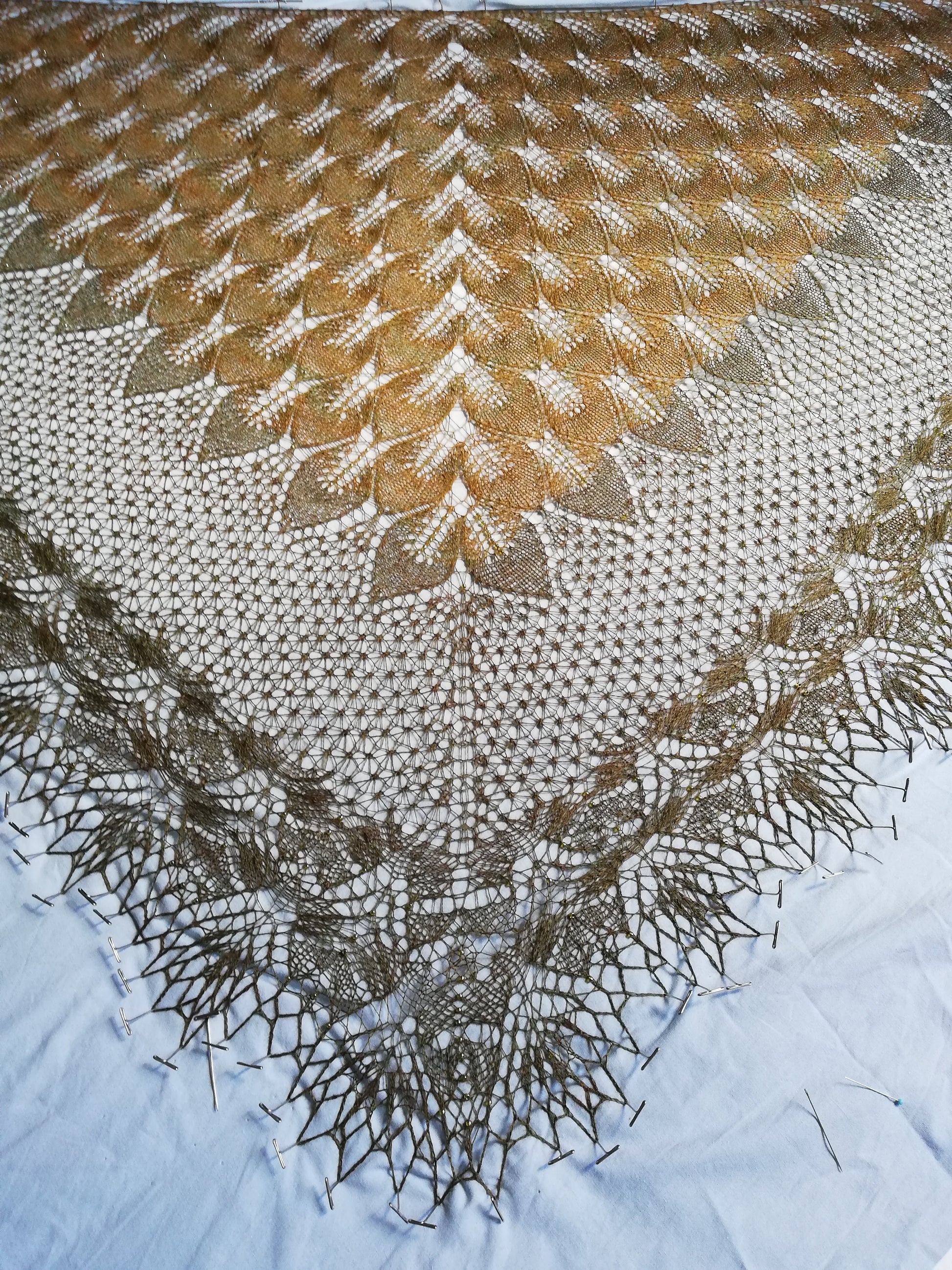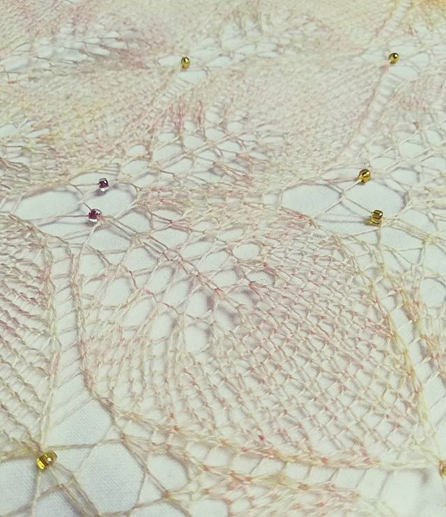 A triangular shawl with leaves, mesh and a stunning edge. Beads ad a little sparkle and extra interest. There are many possibilities with this shawl in colour and bead use.